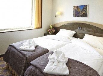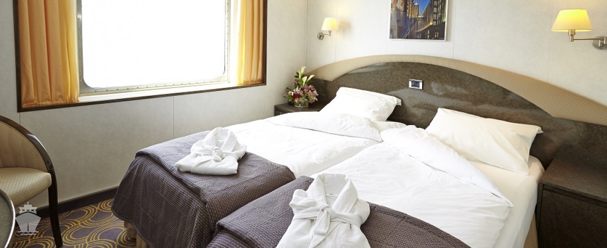 Celkem 197 pohodlných kajut je zařízených v příjemných teplých barvách. Základní vybavení: prostorný šatník, regulovatelná klimatizace, Tv s palubními videoprogramy, župany, telefon, trezor, koupelna se sprchou a WC, fén, minibar.