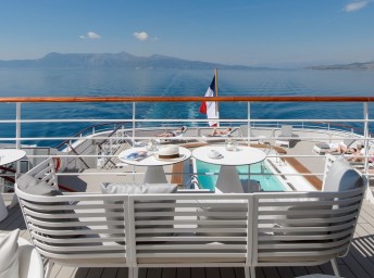 Plachetnice Le Ponant má sluneční palubu s rozlohou 400 m², platformu na vodní sporty, společenskou místnost, butik a společenskou místnost pro trávení volného času.