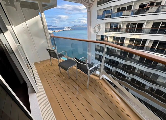Kajuta s balkónem: 16 - 17 m², kajuta s manželskou postelí (na požádání 2 oddělené postele) a rozkládací pohovka. Klimatizace, koupelna se sprchou nebo vanou a WC, toaletní stolek, prostorná skříň, interaktivní TV, telefon, sejf, vysoušeč vlasů, virtuální asistentka ZOE. Balkony se stolkem a židlemi. Některé kajuty mají omezený výhled; kajuty PR1, PR2, PR3, PV mají výhled na promenádu.