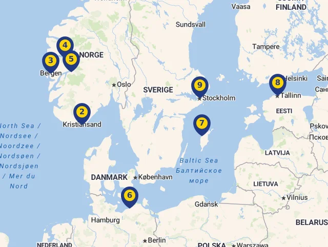 Poznejte místa, kde Vaše loď během plavby zakotví! Každá zastávka je označena číslem, které odpovídá její pozici na mapě, abyste mohli snadno sledovat celou trasu. Stačí kliknout na vybranou destinaci a zjistíte více o každé z nich. Pro lepší přehled si můžete celý program plavby prohlédnout přímo na mapě.