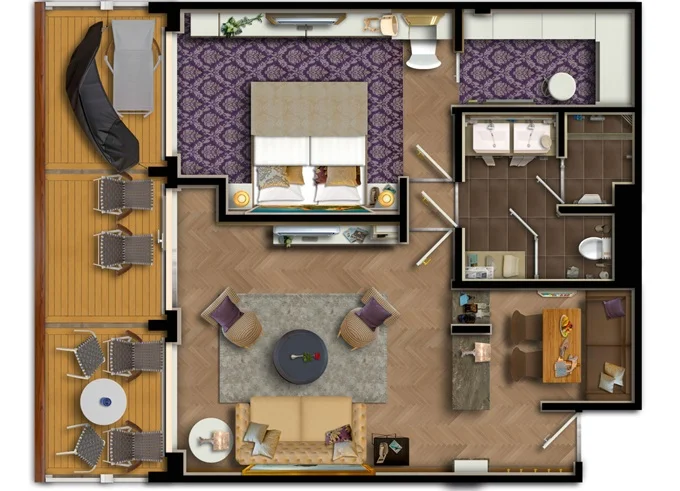 | SUTO - Themen Suite 54 m² + balkon 15 m² se stolem, lehátkom a houpací sítí. Ložnice, Obývací část, šatník. 10. paluba. Max 4 osoby. Výhody Suite. | 138 093 Kč 46 031 Kč za osobu | ||
