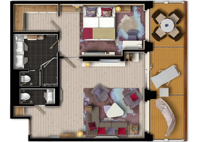 | SUTO - Themen Suite 54 m² + balkon 15 m² se stolem, lehátkom a houpací sítí. Ložnice, Obývací část, šatník. 14. paluba. Max 4 osoby. Výhody Suite. | 475 571 Kč 475 571 Kč za osobu | ||