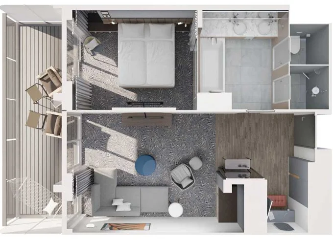 | JKCO - Junior Suite s balkonem C 26 m² + balkon 7 m² se židlemi a podnožkami. 7. paluba. Max 4 osoby. Výhody Junior Suite. | 249 399 Kč 249 399 Kč za osobu | ||